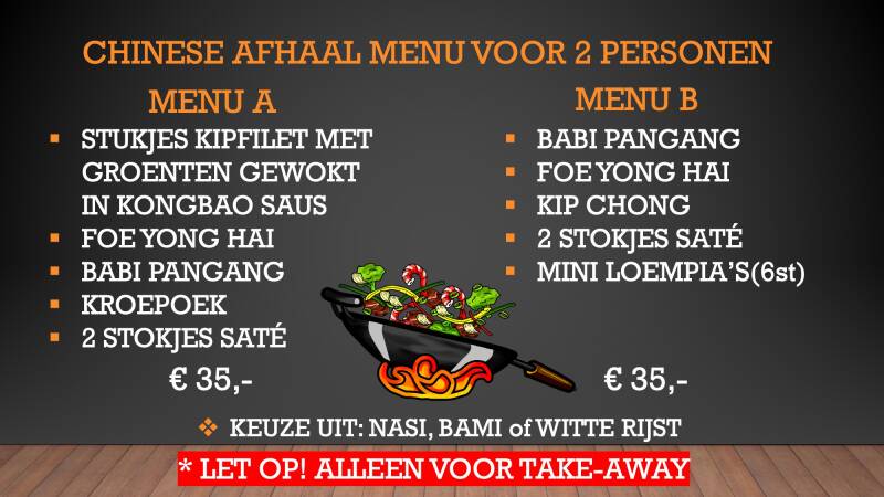 Wij hebben 2 soorten Aziatische menu's samengesteld waarvan u thuis heerlijk kunt genieten.